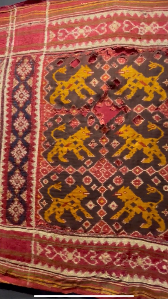 But the mystery doesn’t stop there. Many Patola pieces found across Asia bear curious signs, holes intentionally cut into the fabric. Why? Because it’s believed that mixing shreds of Patola cloth with water creates a potent medicine, capable of healing the sick. The idea that a piece of fabric could hold such mystical properties adds an almost magical allure to the exhibit.