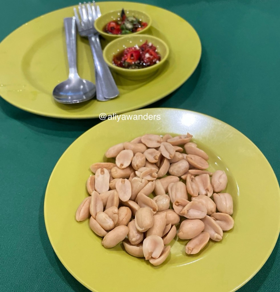 As soon as you’re seated, a small plate of peanuts, wet wipes, and bird’s eye chilies in soy sauce will be brought to your table, a spicy treat for the brave-hearted. Note that the wet wipes aren’t complimentary, so feel free to return them if you don’t need them. For your convenience, sinks are available throughout the restaurant for handwashing.