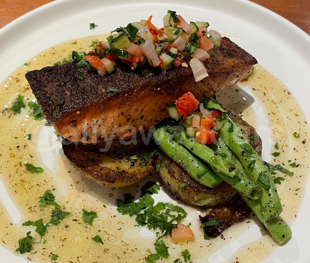 We went all in and ordered five dishes, starting with the Summer Salmon, a pan-grilled salmon fillet paired with roasted potatoes, French beans, and a honey lime herb dressing, topped with their signature strawberry-chili salsa.