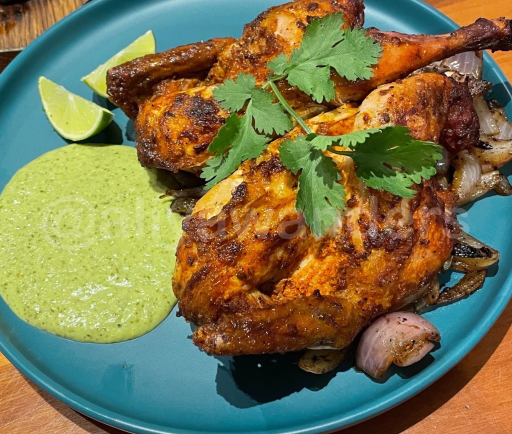The Peruvian Chicken is a roasted and grilled whole spring chicken, served with Aji Verde (a spicy green sauce), roasted potatoes, and onions. I copy pasted this directly from the menu.