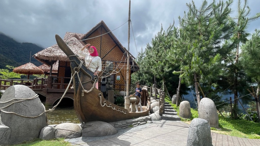 After exploring every nook and cranny, we realized two hours had flown by. The uphill trek to the café was a bit of a hike, but it was worth it. Before arriving, we were greeted by a large woven-walled building with a watermill surrounded by a serene pond, likely a tribute to Esgaroth, the lake-town. At the end of the pond, a ship rests in port, reminiscent of the scene where the elves sail back to Valinor.