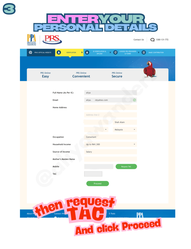 3. Once your email is verified, it’s time to enter the rest of your personal details. These details are required before you can proceed. Request and enter your TAC before clicking Proceed.