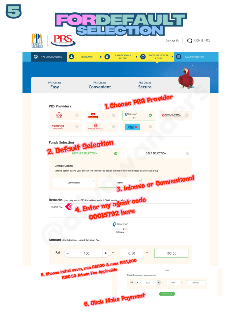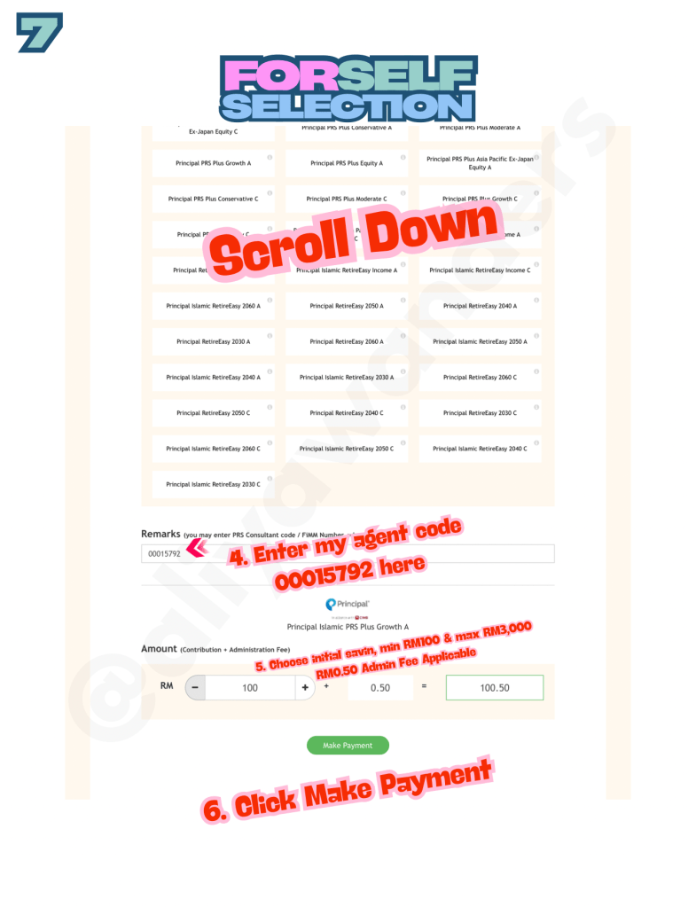 7. Next, enter my agent code 00015792 in the designated column. Then, choose your initial saving amount—just like in the Default Selection, you can select between RM100 and RM3,000. A RM0.50 admin fee applies regardless of the amount.