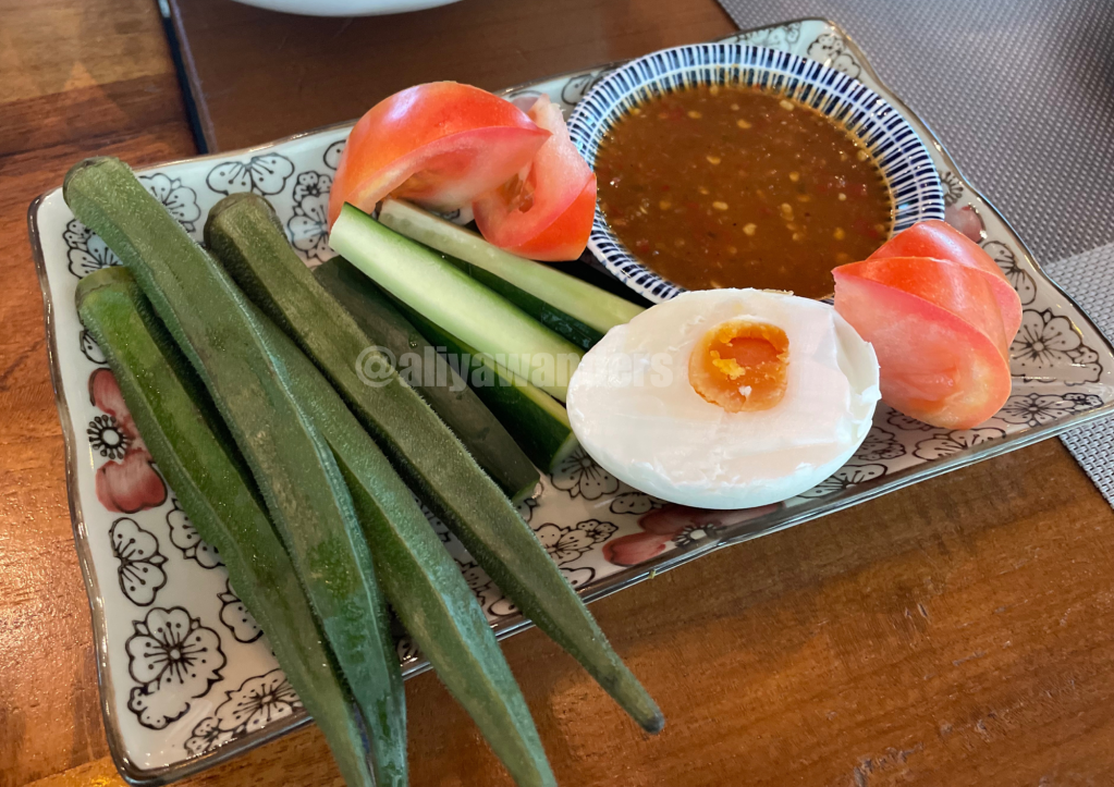 Today’s ulam lineup? Fresh cucumber, tomato, okra, and half a salted egg. And of course, no ulam is complete without sambal belacan (shrimp paste with chili)
