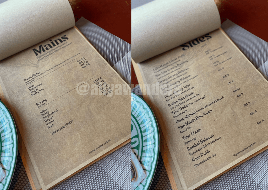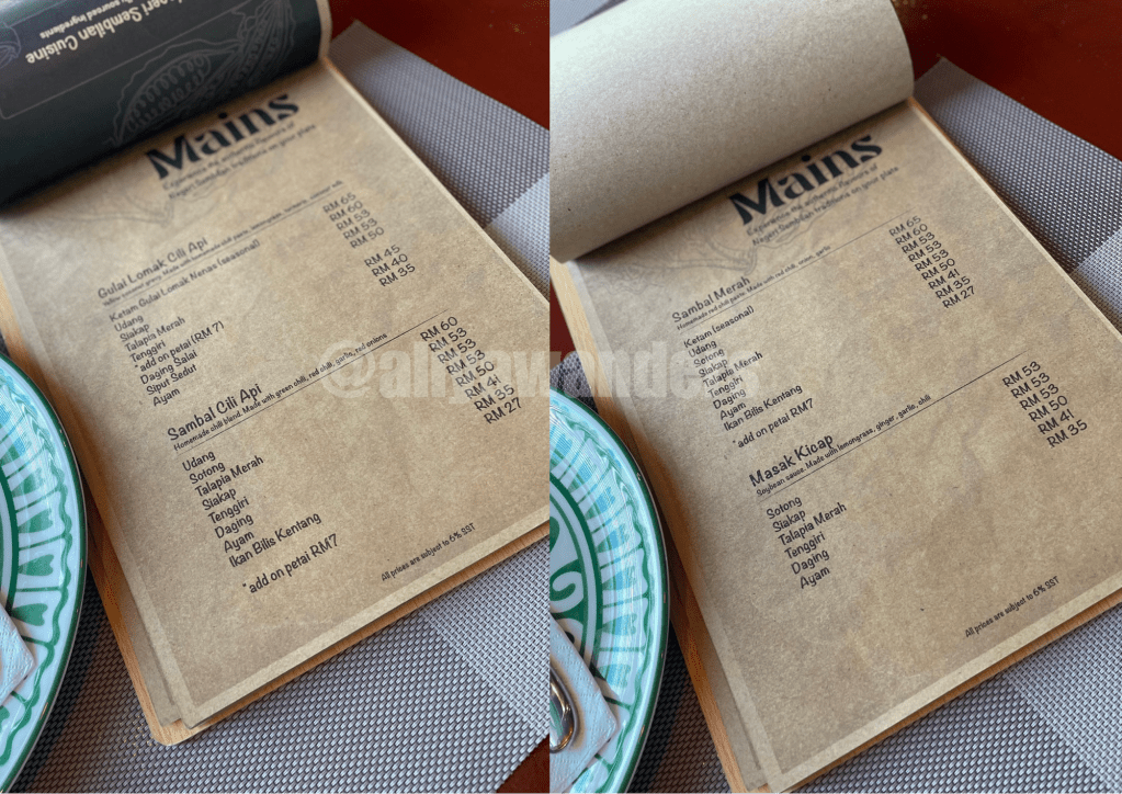 Inside, it’s spacious, with soft Malay music playing in the background. The white walls are decorated with framed photos of traditional Minang houses and their people in traditional attire and again, the rattan pendant lamps hanging from the ceilings.