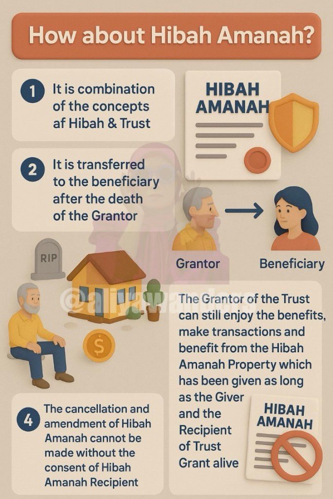 Basically it’s a blend of Hibah and Trust — so you can enjoy the property while you’re alive, live in the house, use the land, or manage the business asset — as long as you’re alive.but it’ll go to the intended person after you pass away.