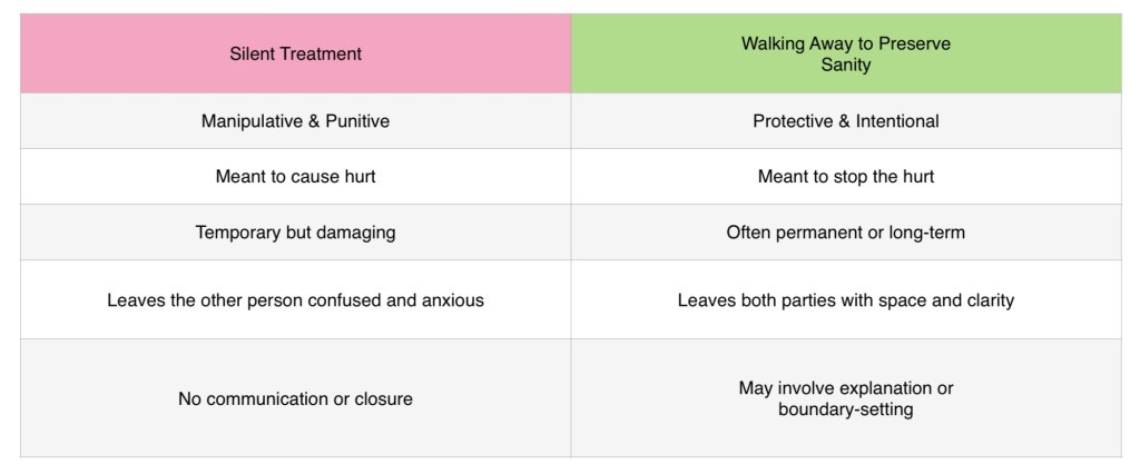 In this case, the person may still care (I’ve done this myself countless times but because I’m preserving my sanity) —but they’re choosing distance because staying would destroy them emotionally or mentally. It’s an act of self-protection, not silent punishment.