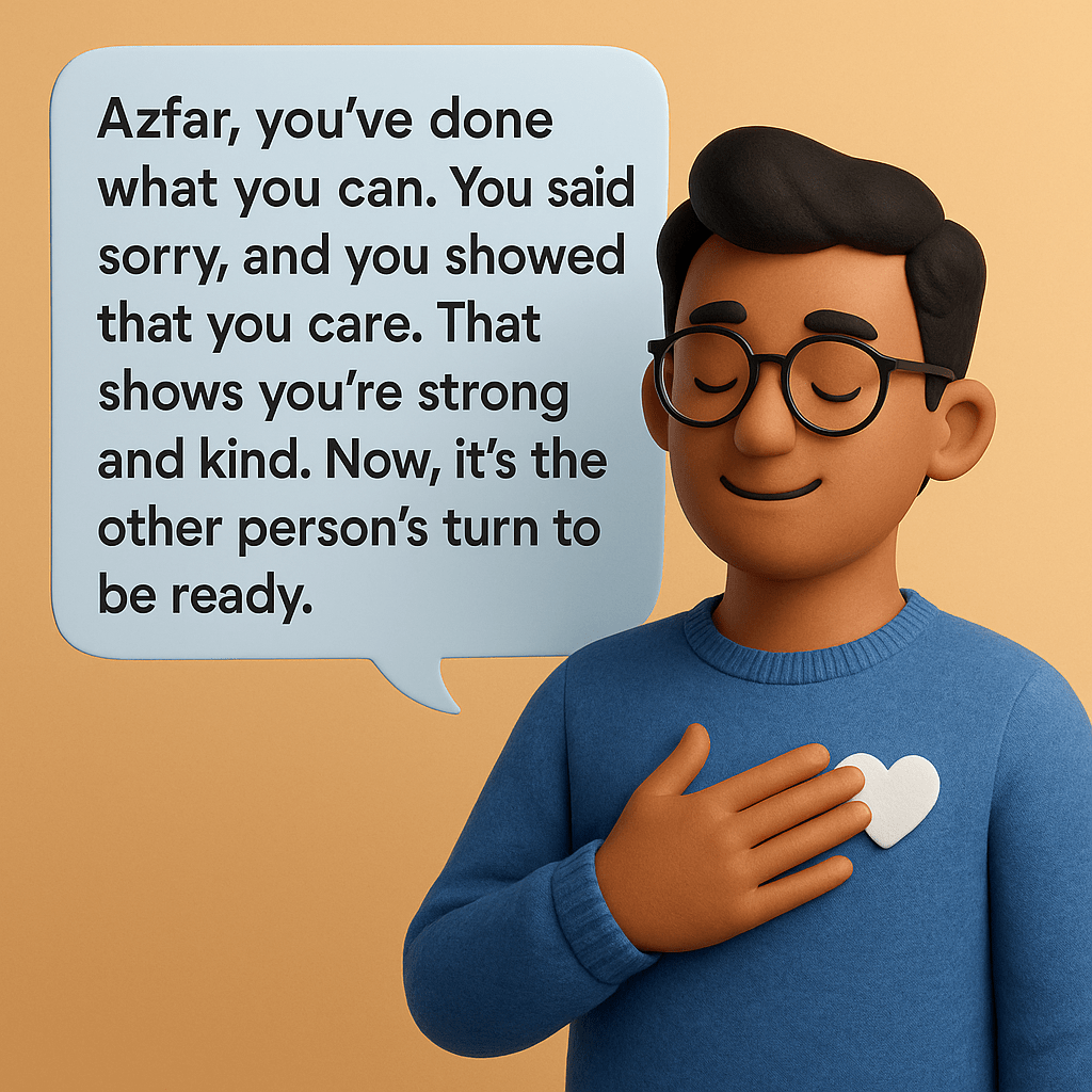 “Azfar, you’ve done what you can. You said sorry, and you showed that you care. That shows you’re strong and kind. Now, it’s the other person’s turn to be ready.”