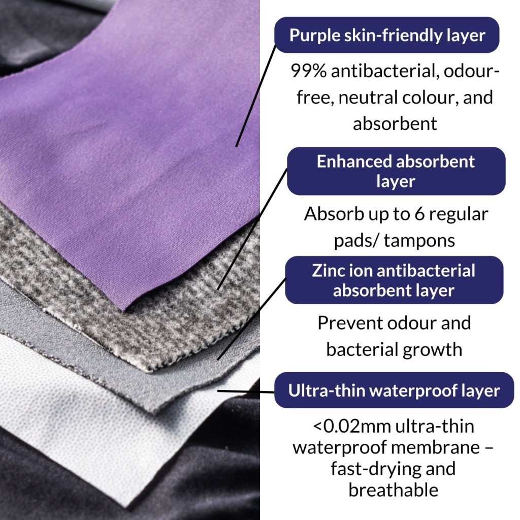 And here’s something I personally appreciate: many period panties use a black top layer. While practical (since stains are less visible), it also makes it harder to be sure your reusable panties are truly clean after washing. Go&Move™, on the other hand, uses a purple, skin-friendly antibacterial layer — easier to check, easier to maintain hygiene.