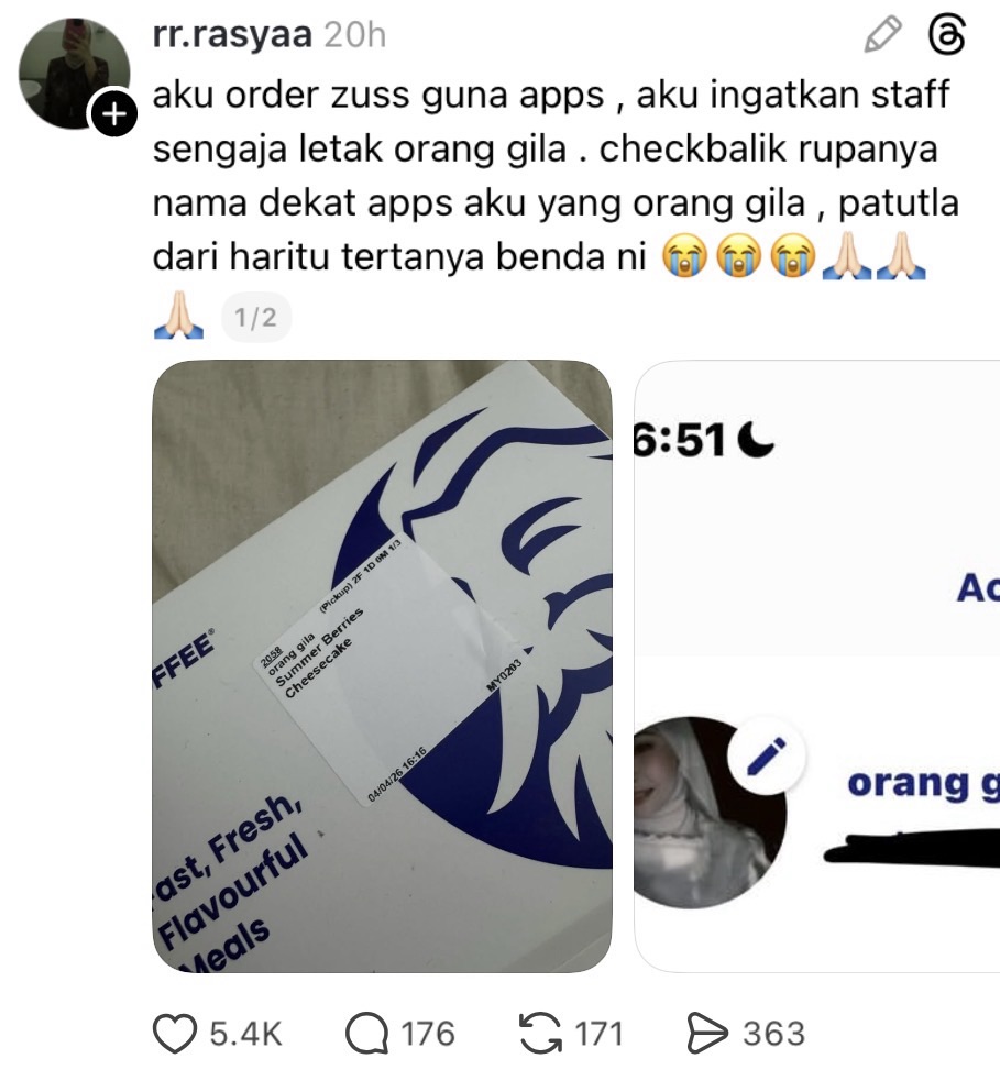For context, OP was confused why her orders kept showing ‘crazy person’… until she realised she was the one who named herself that in the app 💀